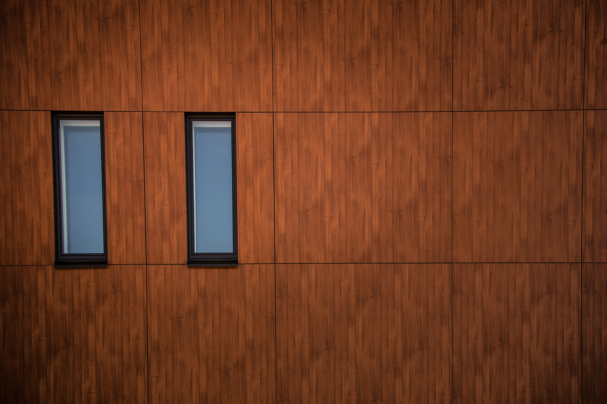 Etujulkisivun fundermax asennus lähikuvassa. Levyn pintaan asennettu tehostekuvio laminaatista.